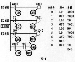 第3梯級(jí);左邊第一個(gè)觸點(diǎn)為常閉,上標(biāo)為M0, M為輔助繼電器(該繼電器有多種,注意類別),其指令的正確表示應(yīng)為:4、LDI M0(如程序所示)。本梯級(jí)的第2行第一個(gè)觸點(diǎn)為常開,上標(biāo)為Y000,Y表示輸出繼電器,由于該觸點(diǎn)與后面Y001觸點(diǎn)呈串聯(lián)關(guān)系,形成了所謂的電路"塊",故而其觸點(diǎn)的指令應(yīng)為 5、LD Y000。總之LD與LDI指令從上面可以看出,它們均是左母線每一梯級(jí)第一觸點(diǎn)所使用的指令。而梯級(jí)中的支路(即第3梯級(jí)的第2行)有二個(gè)或二個(gè)以上觸點(diǎn)呈串聯(lián)關(guān)系,其第一觸點(diǎn)同樣按LD或LDI指令??墒褂肔D、LDI指令的元件有:輸入繼電器X、輸出繼電器Y、輔助繼電器M、定時(shí)器T、計(jì)數(shù)器C、狀態(tài)繼電器S。OUT為線圈驅(qū)動(dòng)指令,該指令不能出現(xiàn)在左母線第一位。驅(qū)動(dòng)線圈與驅(qū)動(dòng)線圈不能串聯(lián),但可并聯(lián)。同一驅(qū)動(dòng)線圈只能出現(xiàn)一次,并安排在每一梯級(jí)的最后一位。如上圖中的1、OUT Y000,3、OUT Y001,Y為輸出繼電器,其線圈一旦接獲輸出信號(hào),可以這樣認(rèn)為,線圈將驅(qū)動(dòng)其相應(yīng)的觸點(diǎn)而接通外部負(fù)載(外部負(fù)載多為接觸器、中間繼電器等)。而上圖8、OUT T0 K40 為定時(shí)器驅(qū)動(dòng)線圈指令,其中的K為常數(shù)40為設(shè)定值(類似電工對(duì)時(shí)間繼電器的整定)??墒褂肙UT指令元件有:輸出繼電器Y、輔助繼電器M、定時(shí)器T、計(jì)數(shù)器C、狀態(tài)繼電器S。