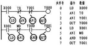 可以看出上圖的X000、X001、M0三者處于并聯(lián)關(guān)系。由于X000下面二條支路均為單個(gè)觸點(diǎn),因X001是常開觸點(diǎn),故用OR指令。而M0是常閉觸點(diǎn),則用ORI指令。三接點(diǎn)并聯(lián)后又與M1串聯(lián),串聯(lián)后又與Y000并聯(lián),而Y000也是單個(gè)觸點(diǎn),所以仍采用OR指令。可使用OR、ORI指令元件有:輸入繼電器X、輸出繼電器Y、輔助繼電器M、定時(shí)器T、計(jì)數(shù)器C、狀態(tài)繼電器S。