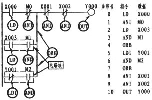 由上圖可以看出,第一支路X003的常開觸點(diǎn)與M1的常開觸點(diǎn)成串聯(lián)關(guān)系(在這樣的情況下,形成了塊的關(guān)系),它是與上一行的X000與M0串聯(lián)后相并聯(lián),此時(shí)程序的編寫,如步序號(hào)0、1、2、3、4所示。4所出現(xiàn)的第一個(gè)ORB指的是與上一行并。而第二支路,常閉Y001與M2同樣是串聯(lián)關(guān)系。也是一個(gè)塊結(jié)構(gòu),其串聯(lián)后再與第一支路并。故步序7再次出現(xiàn)ORB。ORB指令并無(wú)梯形圖與數(shù)據(jù)的顯示??梢赃@樣認(rèn)為;它是下一行形成電路塊的情況下與上一行并聯(lián)的一條垂直直線(如圖中所示的二條粗線)。