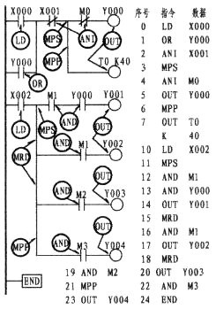 (6)進(jìn)棧指令MPS、讀棧指令MRD、出棧指令MPP和程序結(jié)束指令END;MPS、MRD、MPP這是一組堆棧指令。如下圖使用的二種堆棧形式;在堆棧形式下MPS應(yīng)與MPP成對(duì)出現(xiàn)使用。如在第一堆棧形式下,則采用MPS、MPP指令。若在MPS、MPP指令中間還有支路出現(xiàn),則增加MRD指令,如下圖的第二堆棧所示。應(yīng)知道MPS、MPP成對(duì)出現(xiàn)的次數(shù)應(yīng)少于11次,而MRD的指令則可重復(fù)使用,但不得超過(guò)24次。要知道這一組指令,同樣并無(wú)梯形圖與數(shù)據(jù)的顯示??梢赃@樣認(rèn)為;MPS是堆棧的起始點(diǎn),它起到承上啟下的聯(lián)接點(diǎn)作用,而支路的MRD、MPP則與之依次聯(lián)接而已。而END指令則是結(jié)束指令,它在每一程序的結(jié)束的末端出現(xiàn)。