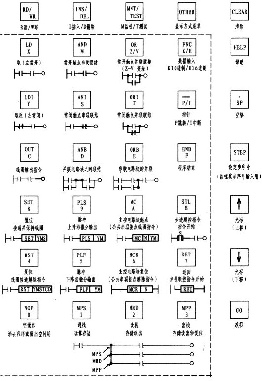4、熟知簡(jiǎn)易編程器各鍵的功能:以下是FX-10P(手持式編程器)面板分布(當(dāng)然少了晶液顯示屏)及各鍵功能。各鍵下方標(biāo)注的中文與元件符號(hào)均為我所增加(目的是為了輸入時(shí)易找到對(duì)象),其余均與原鍵盤相同(即實(shí)線框內(nèi)英文與數(shù)碼)。