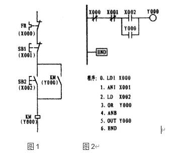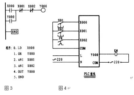 工作原理:以圖3為例說(shuō)明,當(dāng)外接啟動(dòng)按鈕一按,X000的常開接點(diǎn)立即閉合電流(實(shí)為能流),流經(jīng)X001、X002的常閉接點(diǎn)至使輸出繼電器Y000閉合,由于Y000的閉合,并接于母線側(cè)的Y000常開觸點(diǎn)閉合形成自保,由輸出繼電器接通外部接觸器,從而控制了電動(dòng)機(jī)的運(yùn)行。停止時(shí)按外部停止按鈕,X001常閉接點(diǎn)在瞬間斷流從而關(guān)斷了輸出繼電器線圈,外部接觸器停止運(yùn)轉(zhuǎn)。當(dāng)電動(dòng)機(jī)過(guò)載時(shí),外部熱繼電器常閉接點(diǎn)閉合,導(dǎo)至X002常閉接點(diǎn)斷開,從而保護(hù)電動(dòng)機(jī)。