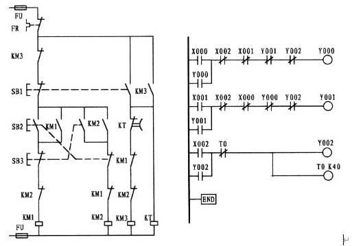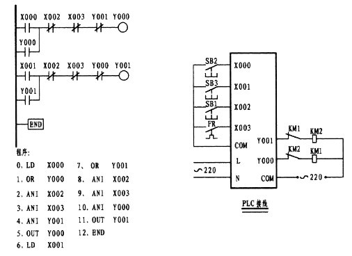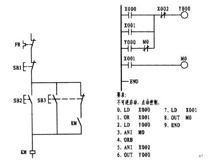 這一道題往往是初學(xué)者邁不過(guò)的一道坎。這主要是因?yàn)槔^電器電原理圖使用的是復(fù)合按鈕,形成的思維定式所造成。從梯形圖中可以看出,X001為點(diǎn)動(dòng)控制觸點(diǎn),因左邊的電原理圖是使用的復(fù)合按鈕,思維上自然而然轉(zhuǎn)向了采用X001的常閉觸點(diǎn),與X001的常開形成了與復(fù)合按鈕相似的效果,想象是不錯(cuò)。要知道PLC在運(yùn)行狀態(tài)下,是以掃描的方式按順序逐句掃描處理的,掃描一條執(zhí)行一條,掃描的速度是極快的。如果是用X001的常閉代替M0的常閉的話,當(dāng)按下外接點(diǎn)動(dòng)按鈕時(shí),X001常開觸點(diǎn)則閉合而常閉接點(diǎn)則斷開,但一旦松手其常閉觸點(diǎn)幾乎就閉合形成了自保,因此失去了點(diǎn)動(dòng)的功能,變?yōu)橹挥袉?dòng)的功能。梯形圖中的第一梯級(jí)中的第二支路是由Y000的常開與中間繼電器M0的常閉相串后再與第一支路相并,在這樣觸點(diǎn)多的情況下如果允許應(yīng)將它擺列在第一行,這樣在編程時(shí)可以少用了ORB指令。