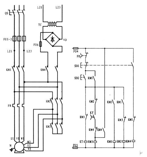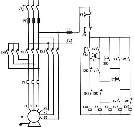 該線路控制的是一臺(tái)雙速電動(dòng)機(jī),一般的人對(duì)它不是很理解。電動(dòng)機(jī)型號(hào)為YD123M-4/2,6.5/8KW,△/Y。根據(jù)型號(hào)解讀;該電機(jī)具有二種速度即4極和2極,在4極速度下,電動(dòng)機(jī)的功率為6.5KW,繞組為三角形接法。如果在2極的速度下,電動(dòng)機(jī)的功率為8KW,繞組為雙星接法。該電動(dòng)機(jī)共有6接線頭,三角形接時(shí)(低速)電源由U1、V1、W1接入,其余接頭U2、V2、W2為懸空。星接時(shí)(高速)將接線頭U1、V1、W1接成星點(diǎn)形成了雙星點(diǎn),三相電源則由U2、V2、W2輸入(電動(dòng)機(jī)接線圖詳上圖所示)。該線路要求;電機(jī)可以在低速、高速狀態(tài)下?lián)衿湟贿\(yùn)行。而在高速運(yùn)行時(shí)則按低速啟動(dòng)再轉(zhuǎn)為高速運(yùn)行。自己可根據(jù)電原理圖進(jìn)行分析。